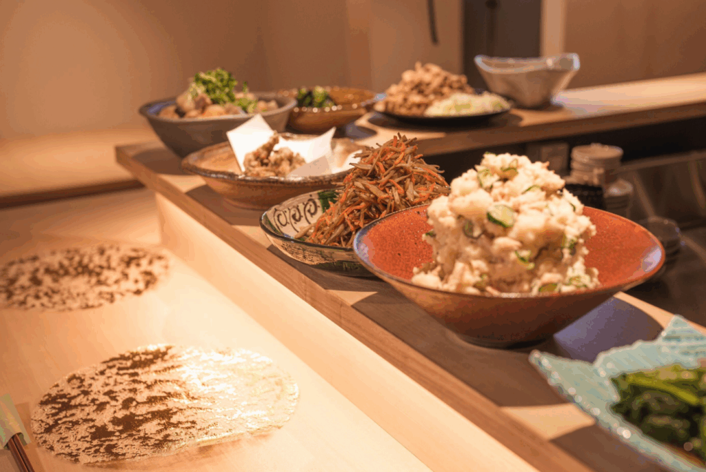 「和食の創作料理は緊張する」という方も、懐かしさを感じるおばんざいを楽しめるので、ぜひデビューしてみてください。おばんざいは日替わりで並び、単品・3種・5種・7種から選べます。定番のだし巻きたまごやおでんもあるので、「いつもの」が食べたい方も安心です。ラインナップ豊富な日本酒や焼酎との組み合わせをお楽しみください。